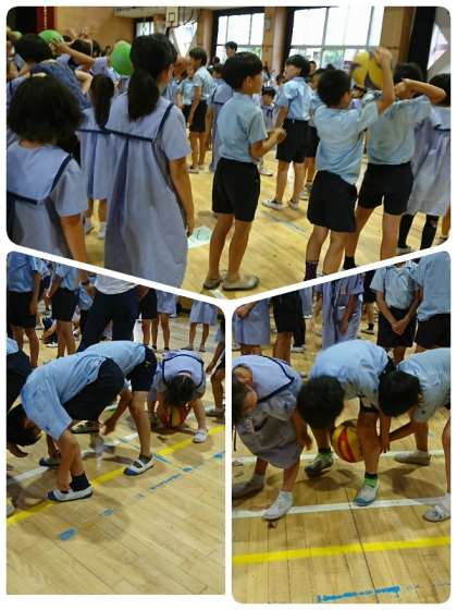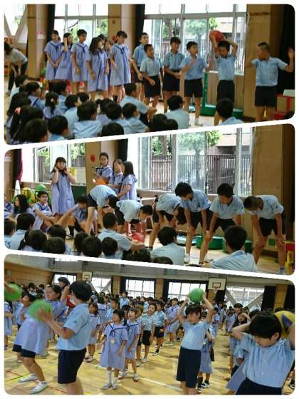 今日の集会は、「ボールおくり」。まず、集会委員会の子ども達がみんなの前でお手本を見せてくれました。