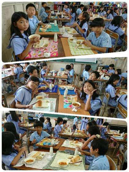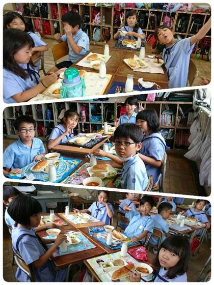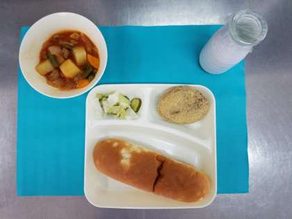 今日の給食は、チキンレバーカツ、ケチャップ煮、キャベツときゅうりのサラダ、さつまいもパン、牛乳でした。チキンレバーカツは柔らかくて、食べやすかったです。ケチャップ煮は、ホクホクのじゃがいもとにんじん、たまねぎ、鶏肉が入っていました。ケチャップ味がトマトよりも勝っていて、子ども達が好む感じの味付けでした(^.^)