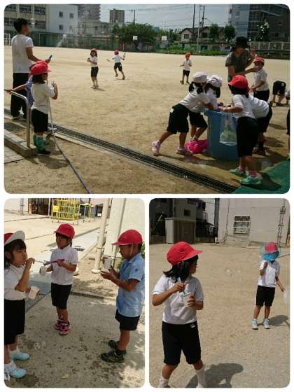 1年生が、2時間目から、2組・3組・1組の順で、「水あそび」をしました。