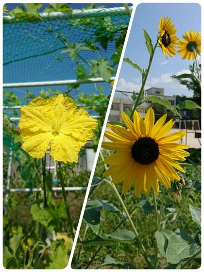 学習園では、ヒマワリやキュウリの花が満開です。
