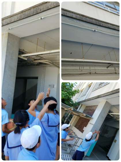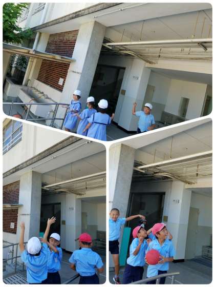 管理作業員さんに熱中症対策として、ミストを設置していただきました。早速、試運転すると、子ども達は「何か降ってきた。」と最初びっくりしていました。ミストだと気づくと、その下に集まって涼しんでいました。