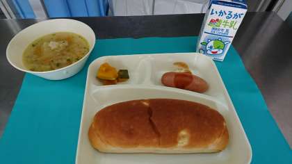 今日の給食のメニューは、フランクフルトのケチャップソースとスープ、焼きかぼちゃ、サツマイモパン、牛乳でした。