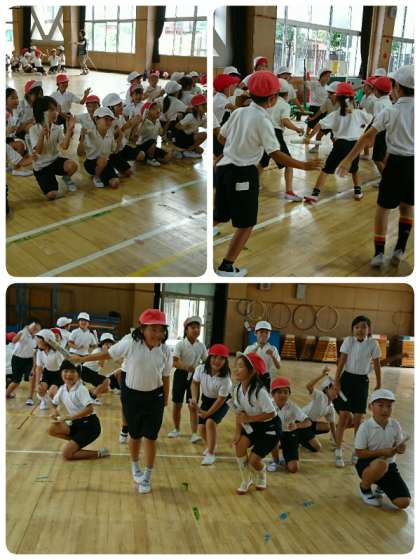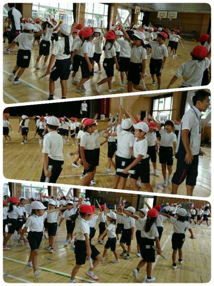 運動会の練習が始まって、子ども達は団体演技(ダンス)の練習をがんばってます。4時間目、講堂では2年生の子ども達がダンスの練習をしていました。子ども達は音楽に合わせてニコニコととても楽しそうに踊っています。私と目があった子ども達は、見て見てというようにアピールしていました。とってもかわいかったですよ。