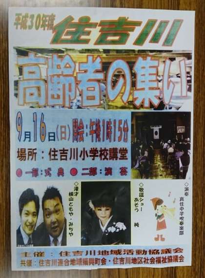 9月16日(日)、住吉川地区社会福祉協議会主催の「住吉川 高齢者の集い」が住吉川小学校の講堂で開催されます。
