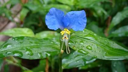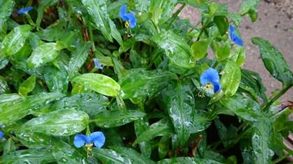 理科室前のプランターに青色のツユクサが色鮮やかに咲いています。おしべが黄色なので青色の花びらに合わさってとてもきれいです。じっくり観察しているとおしべの形もかわいいです。ツユクサの花言葉は、「尊敬」です。