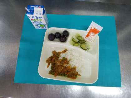 今日の給食は、大豆入りキーマカレー(米粉)、グリーンサラダ、ぶどう(巨峰)、ご飯、牛乳でした。大豆入りキーマカレーは、大豆が細かくて、豆嫌いな子どもも食べやすかったです。ぶどう(巨峰)は、みずみずしくておいしかったです(*^-^*)