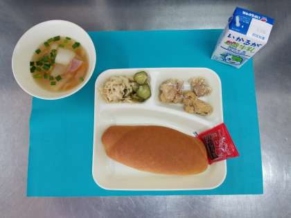 今日の給食は、鶏肉のからあげ、とうがんの中華スープ、切り干しだいこんの辛みづけ、パン、牛乳でした。鶏肉のからあげは、かりっと揚がっていて、おいしかったです。とうがんの中華スープは、とろっと柔らかいとうがん、ハム、玉ねぎ、にんじんが入っていました(^◇^)