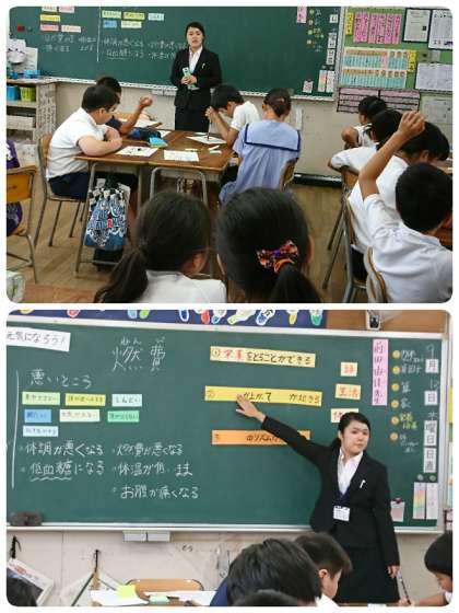 教育実習に来ている先生が、6年生の子ども達に「朝ごはんをもりもり食べて元気になろう!」の授業をしました。
