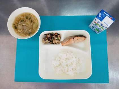 今日の給食は、さけのしょうゆ風味焼き、五目汁、高野どうふのいり煮、ご飯、牛乳でした。さけのしょうゆ風味焼きは、しょうゆ味がほどよくついていて、おいしかったです。五目汁は、たけのこののコリコリ感がよかったです。高野どうふのいり煮は、甘くて、ひじきとグリーンピースが入っていました(^^♪