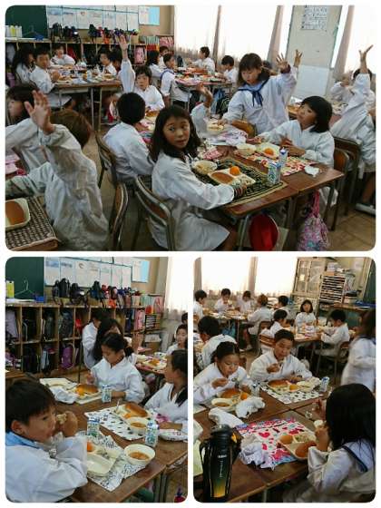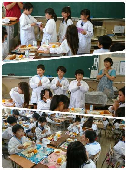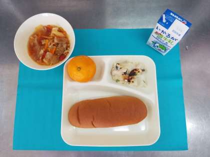 今日の給食は、豆乳マカロニグラタン[米粉]、トマトスープ、みかん(冷)、黒糖パン、牛乳でした。豆乳マカロニグラタンは、米粉と豆乳を使っていて、いつもの味と違うマカロニグラタンでした。トマトスープは、酸味が効いていて、おいしかったです。冷凍みかんは、天気が曇りの為、ひえひえの良さをいかせなかったです(・・;)