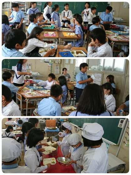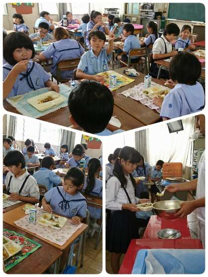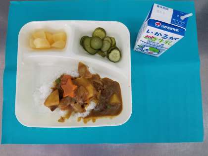 今日の給食は、ビーフカレーライス[米粉]、きゅうりのピクルス、白桃(カット缶)、ご飯、牛乳でした。ビーフカレーライスは、おいしくて、子ども達に好評でした。4年生では、誕生日と教育実習生が来たお祝いに牛乳で乾杯をしていました(^^)/