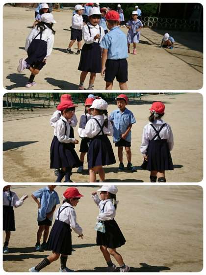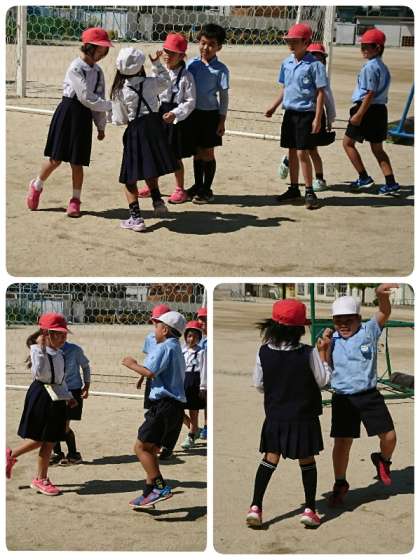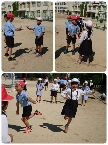 1年生が、楽しそうにSケンをしていました。S字の上をケンケンで進み、相手と出会ったところでジャンケンポン。勝ったらそのまま進み、負けたら次の子に交代です。