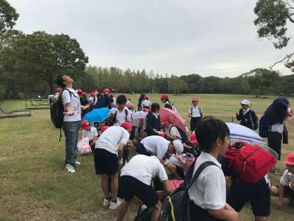 子ども達が芝のところで遊んだ後に、ついに雨が降ってきました。