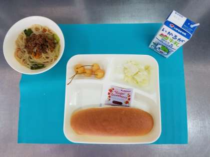 今日の給食は、タンタンめん、キャベツの甘酢づけ、さくらんぼ(缶)、パン、いちごジャム 牛乳でした。タンタンめんは、ひき肉がたっぷりでおいしかったです。さくらんぼは、みずみずしく、甘かったです(^.^)