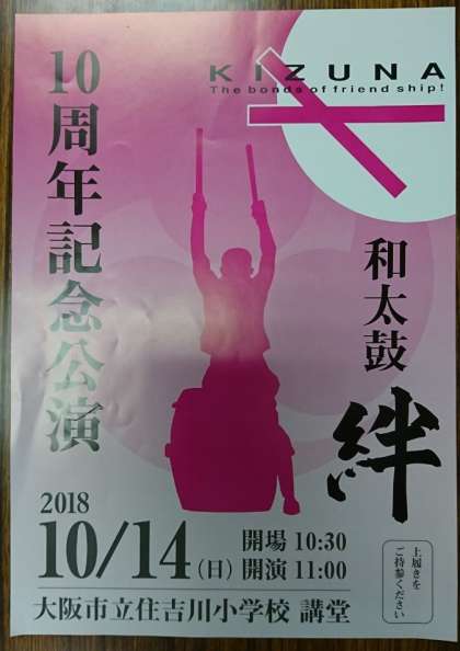 住吉川小学校 生涯学習ルームの「和太鼓 絆」の10周年記念公演が10月14日(日)に開催されます。