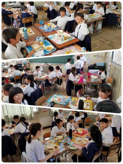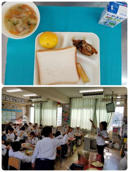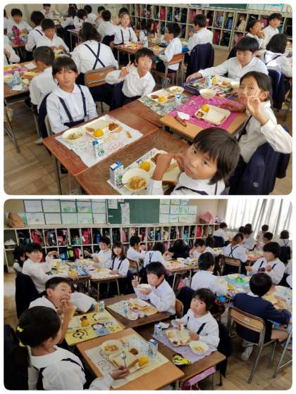 今日の給食は、なすのミートグラタン、鶏肉と野菜のスープ、みかん、食パン、はちみつ、牛乳でした。なすのミートグラタンは、子ども達に好評でした。鶏肉と野菜のスープは、にんじん、キャベツ、じゃがいもが柔らかくて、チキンスープがおいしかったです。みかんは、甘くて、果汁たっぷりでした(*^▽^*)