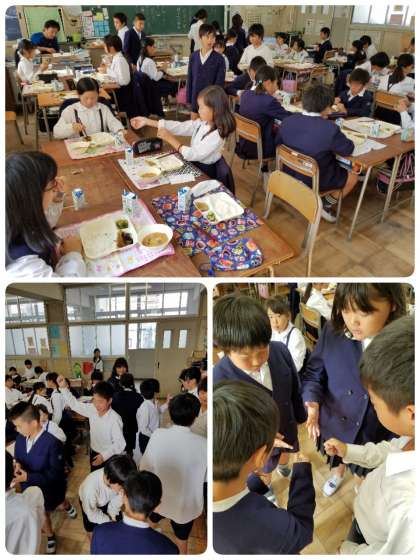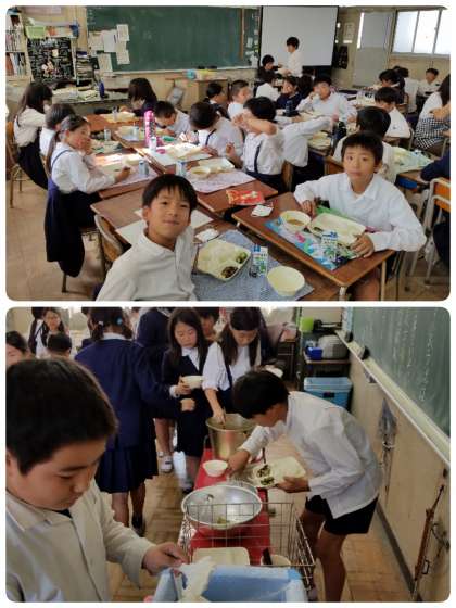 今日の給食は、お好み焼き、豚汁、きゅうりの梅風味、ご飯、牛乳でした。お好み焼きは、子ども達に大人気でした。豚汁は、野菜が多く、豚肉も柔らかく、おいしかったです。余った牛乳を飲むために、じゃんけん大会が始まっていました。(*^-^*)