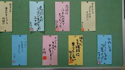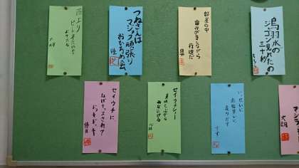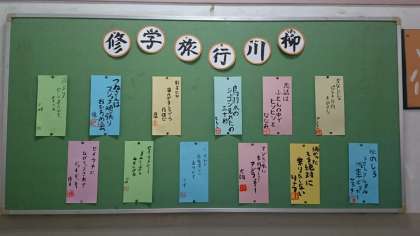 6年の掲示板に「修学旅行川柳」が掲示されています。修学旅行の帰りの電車の中で子ども達が作っていた川柳。1泊2日の修学旅行の楽しかった思い出がぎっしり詰まっています。