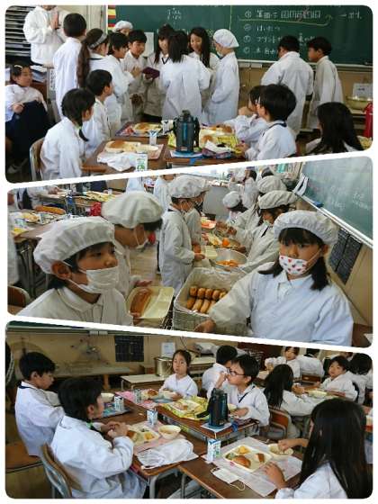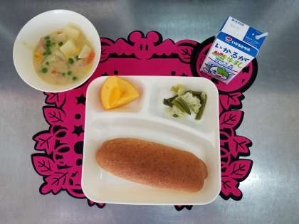 今日の給食は、コーンクリームシチュー[米粉]、キャベツと三度豆のサラダ、かき(平核無柿)、パン、牛乳でした。コーンクリームシチューは、ほくほくじゃがいも、にんじん、たまねぎ、コーンが入っていました。砂糖、塩、ワインビネーガーで味がついたキャベツと三度豆のサラダは、さっぱりしておいしかったです。かき(平核無柿)は、熟していて甘かったです