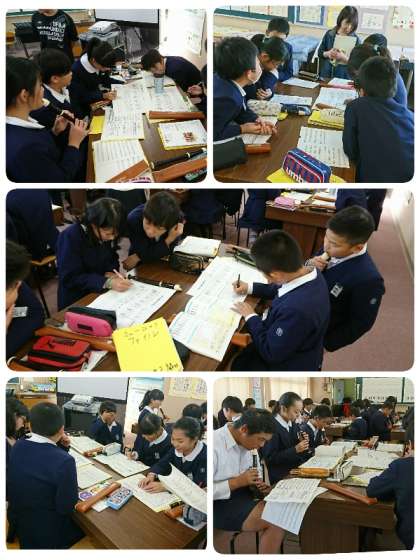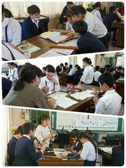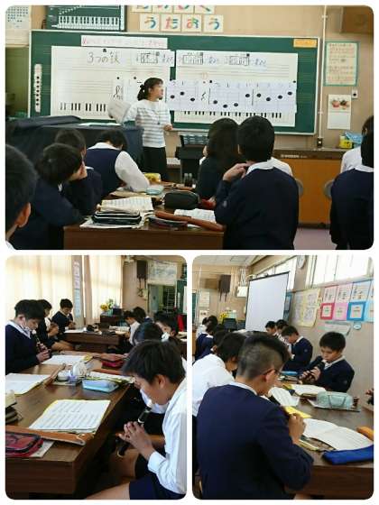 5・6時間目、6年生の音楽の学習を見に行きました。「お気に入りのメロディーでカノンをつくろう」の学習でした。本時の学習のめあては「つくった旋律をよりかっこよく変身させよう」で、前時にグループで作った旋律のリズムをアレンジして曲づくりを楽しみました。
