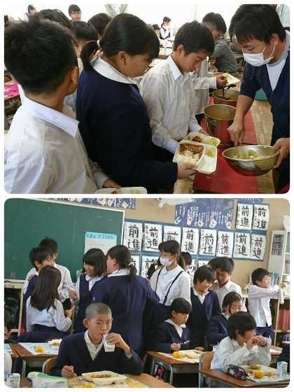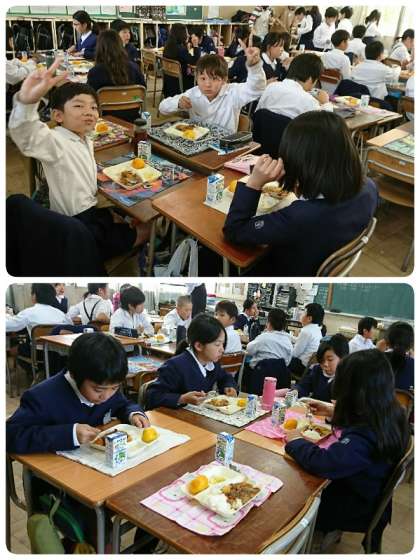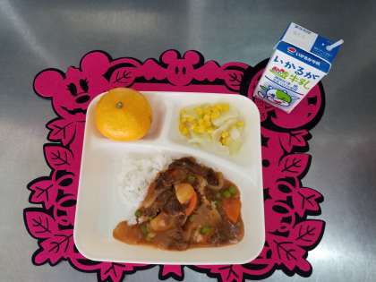今日の給食は、ハヤシライス[米粉]、キャベツとコーンのサラダ、みかん、ご飯、牛乳でした。ハヤシライスは[米粉]でしたが、味が変わらずおいしくいただきました。みかんは、甘くて果汁がたっぷりでした(^◇^)