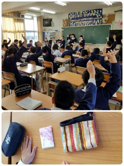 6年生の計算タイム。今日は、百マス計算をしていました。計算が終わると同時に「はい。」と声をあげ、自分のタイムを教えてもらっていました。みんな凄い勢いで鉛筆をはしらせていました。また、「ハンカチとティシュ調べ」も行っていました。みんなしっかり持ってきている様子でした