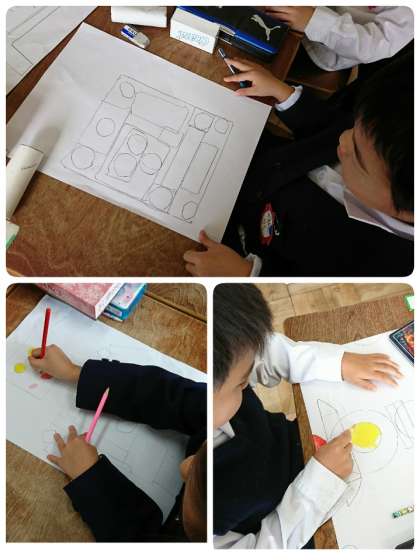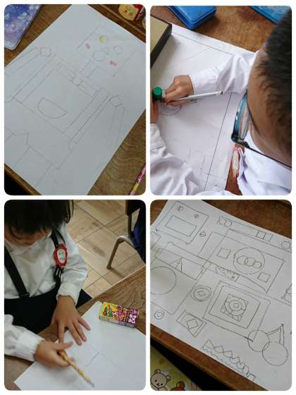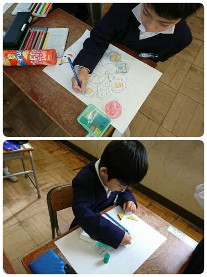 1年生が、算数「はこのかたち」の学習をしてから、いろいろな形の箱を使って絵をかいていました。円・三角形・正方形・長方形を組み合わせて、ロボットやロケット、雪だるまに木など、思い思いに表現していました。今度の土曜授業の時に掲示する予定です。