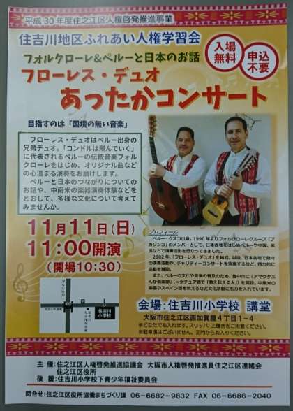 今年は、「フローレス・デュオ あったかコンサート」で、フォルクローレ&ペルーと日本のお話です。申し込み不要、入場無料となっています。ぜひ、お越しください。お待ちしています。