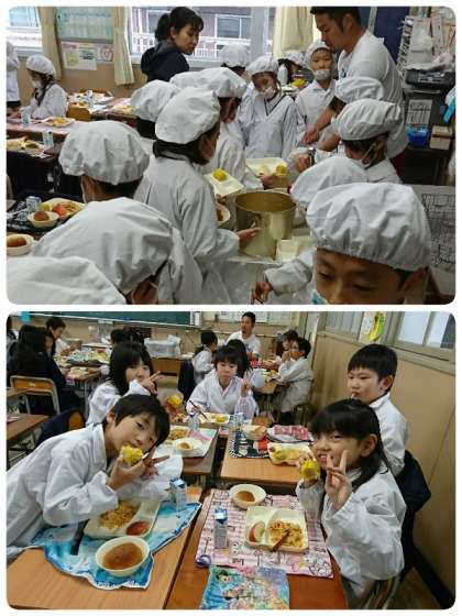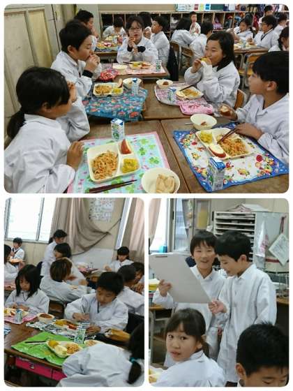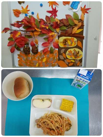 今日の給食は、チキントマトスパゲッティ、焼きとうもろこし、りんご、黒糖ミニパン、牛乳でした。チキントマトスパゲッティは、たまねぎ、ピーマン、にんじん、鶏肉、ウインナーが入っていました。焼きとうもろこしは、とても甘かったです(^◇^)