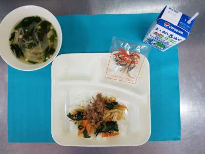 今日の給食は、ビビンバ、わかめスープ、アーモンドフィッシュ、ご飯、牛乳でした。ビビンバは、子ども達に大好評で、ご飯も具も大盛りにして食べていました。わかめスープもピビンバに合っていました(*^^*)
