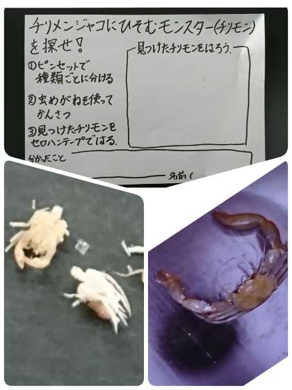 ピンセットと虫眼鏡を駆使し、とっても楽しそうにチリモンを探していました。タコ・エビ・カニ・カニの幼生など、いろんなチリモンが見つかりました。