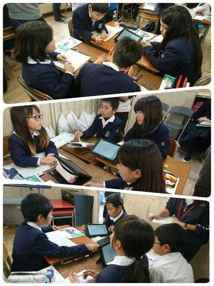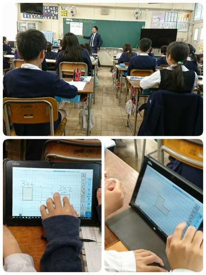 タブレットは、自分の考えをまとめたり話し合いのツールとして使ったりしました。子ども達は、いろいろな求め方を考え、全体で共有することができていました。
