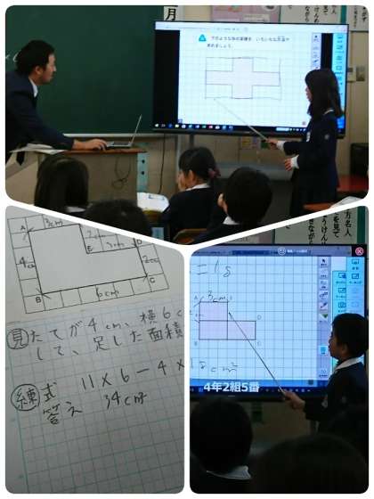 5時間目、4−2の学級で、算数科「広さを調べよう」の単元の複合図形の面積の求め方を考える学習をしました。
