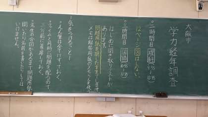 今日の学力調査に向けて気をつけることなど、すごく気合の入った字で板書してありました。担任の先生が子ども達に「がんばれ!」と言っている声が聞こえてきそうです。