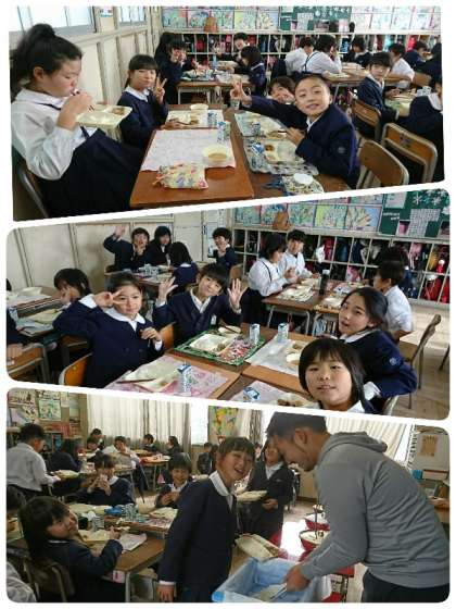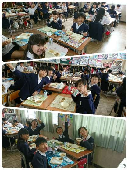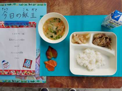 今日の給食は、豚肉のしょうが焼き、みそ汁、だいこんの煮もの、ご飯、牛乳でした。豚肉のしょうが焼きは、豚肉と玉ねぎが甘く、しょうがの味がよく効いていました。だいこんの煮ものは、大根が軟らかく煮てありました。みそ汁は、今日の天気にちょうどよく、体を温めてくれました(*^^*)