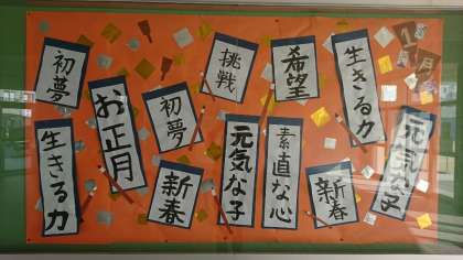 1月の玄関掲示は、掲示委員会の子ども達が書いた書初めです。気合を入れ、心を込めて書きました。