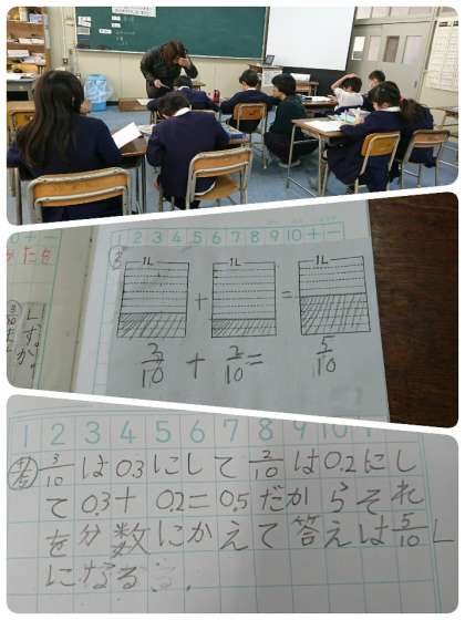「はしたの大きさの表し方を考えよう〜分数を使って」の単元で、分数+分数の計算の仕方を考えました。