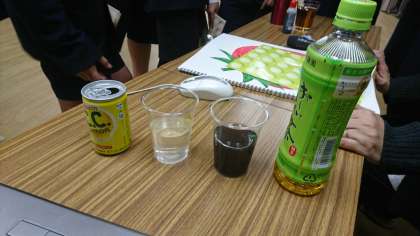薄茶色のうがい薬はジュースを入れると透明になったり、薬が溶けた透明の水にお茶を入れると真っ黒になったりしました。
