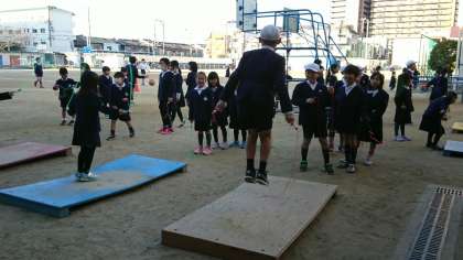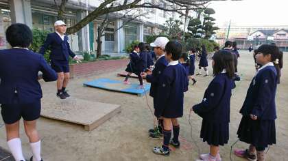 朝も休み時間もジャンピングボードは行列です。1〜6年生が、みんな賢く順番を待って跳んでいます。職員室には子ども達がリズムよく跳んでいる音がよく聞こえてきます。