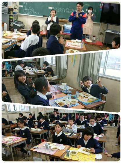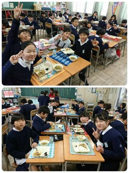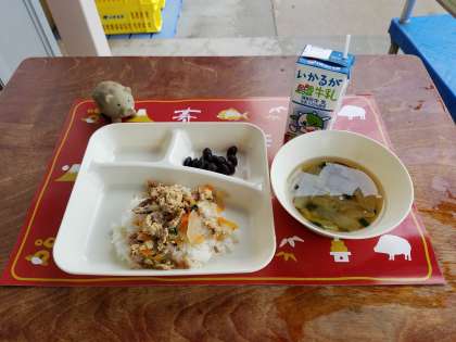 今日の給食は、他人丼、すまし汁、黒豆の煮もの、ご飯、牛乳でした。黒豆の煮ものは、甘くておいしかったです。他人丼は、子ども達に大人気でした。「つゆだくや。うれしい〜。」と言っている子どももいました