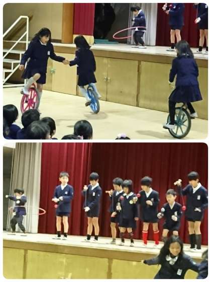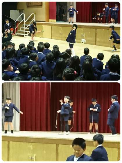 なわとび・サッカー・ピアノ・けん玉・フラフープ・一輪車・こま・キャッチボール・リフティング・テニスリフティング・手品・馬とび・側転・逆立ち歩き・大繩・ダンス・跳び箱など、ご自慢の得意技をいきいきと発表していました。あまりのかわいらしさに思わず微笑んでしまいます。音楽がなると見ている子ども達からも自然と手拍子が起こり、とてもよい雰囲気の中で実施できました。
