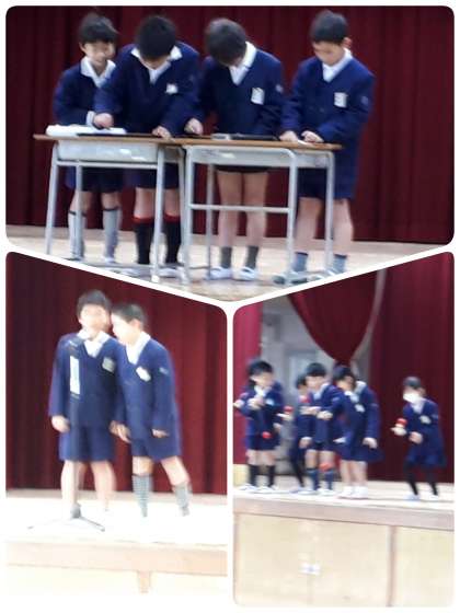 講堂の舞台上とその下に分かれて、10グループが発表しました。