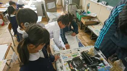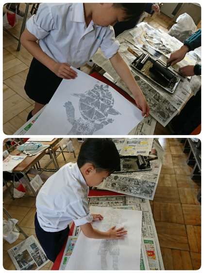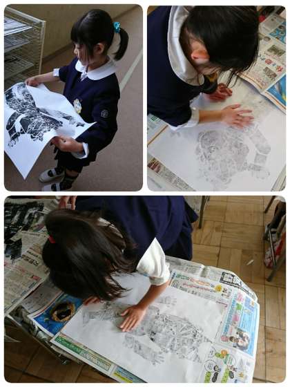 3時間目、1−2の学級では、紙版画の印刷をしていました。この間から画用紙で作成していたかわいいオニにインクをつけてもらいました。それから、和紙の表と裏(ツルツルとザラザラ)を指で確認して、おそるおそるそおっとオニの上に乗せました。次に真ん中から輪を描くように慎重にこすっていきます。できたかなぁとちょっとめくって確認。その時の子ども達の顔が真剣でした。