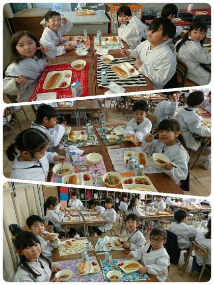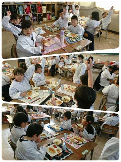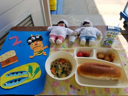 今日の給食は、豚肉とはくさいのうま煮、あつあげのピリ辛じょうゆかけ、いちご、さつまいもパン、牛乳でした。豚肉とはくさいのうま煮は、とろみのあるスープに柔らかい野菜と豚肉が入っていて、おいしかったです。いちごは、甘みがありました。さつまいもパンは、子ども達に好評でした(^◇^)