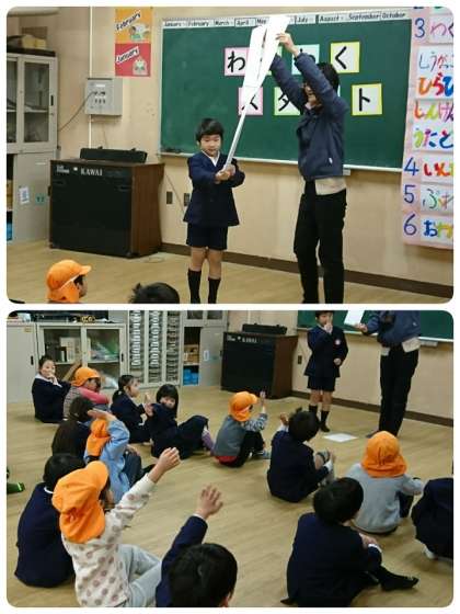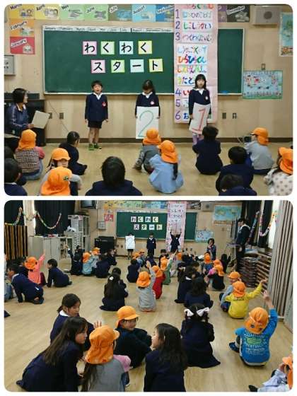 今日は、北加賀屋保育所の子ども達が「わくわくスタート」に来てくれました。1−1の子ども達は、ニコニコ笑顔でうれしそうにしています。北加賀屋保育所の年長さんは、とってもお行儀がよくてお話をしっかり聞いていました。自己紹介をしてから一緒にクイズをしたり遊んだり歌を歌ったりして楽しい時間を過ごしました。