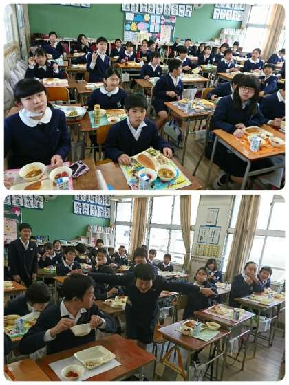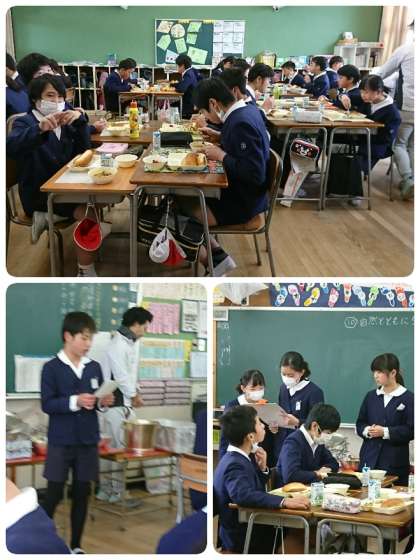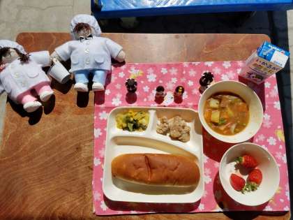 今日の給食は、卒業お祝い献立で、フライドチキン、カレーシチュー、春のカラフルソテー、いちご、さつまいもパン、牛乳でした。フライドチキンとカレーシチューは、子ども達に大好評でした。いちごは、とても甘かったです。子ども達は、この卒業お祝い献立を楽しみしていて、給食前から「先生。今日、からあげ出る?」「カレー?」と聞いていました