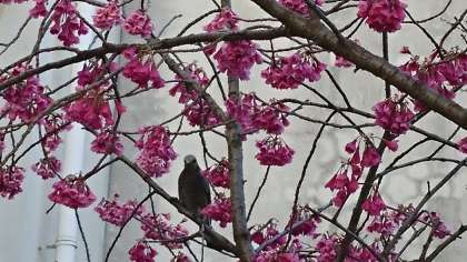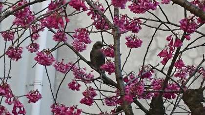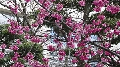 先日より、ヒヨドリがカンヒザクラの枝にとまって花の蜜を吸っている様子がよく見られます。人が寄って行くとさっと飛んで行って、様子をうかがってはまた花の蜜を吸いにやってきます。警戒心が強いのでやっととれた写真です。