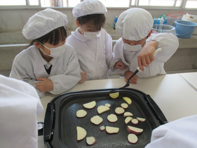 学習園で育てたさつまいもをホットプレートで焼いて食べました。焼いていると、「パチパチ音がしてきた。」「いい匂いがしてきた。」と大興奮。焼き芋はとっても美味しかったようで、どの子も笑顔で溢れていました。