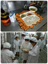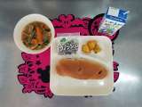 今日の給食は、鶏肉のチリソース焼き、とうふとワンタンの皮のスープ、中華いため、...