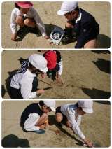 運動場で3年生が理科「日なたと日かげをくらべよう」の学習で、日なたと日かげの地面...